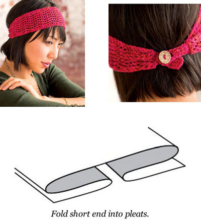 Fold the other short end into pleats according to illustration. With RS facing, pick up and knit 7 sts across the pleated end as for button tab. Work in ribbing patt until tab measures 1" (2.5 cm) from pick-up row when stretched, ending with a WS row. Buttonhole row: (RS) Work 2 sts in patt, work a 3-st one-row buttonhole (see Glossary), k2. Cont in rib patt for 1/2" (1.3 cm) more. BO all sts. Sew button to button tab so that, when buttoned, the headband fits snuggly around the head. Weave in loose ends.