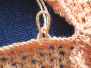 And now it's time for the button! In order to make a piece you like, first determine the desired position of your button on your cowl. Next, thread scrap piece of yarn on tapestry needle and insert it front-to-back through completed piece at desired position. Next, making a small stitch at edge of fabric, thread it back, leaving a loop of desired clasp size on wrong side of fabric. This step should look something like so: