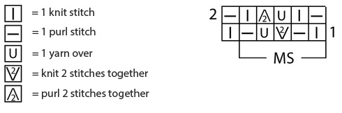 Lace Pattern. Number of stitches multiple of 5 + 1 + 2 edge stitches. Knit according to the chart, which shows the front and back rows. Start with 1 edge stitch, repeat the pattern constantly, end with the stitch after the pattern repeat and 1 edge stitch. Continuously repeat the 1st and 2nd rows.