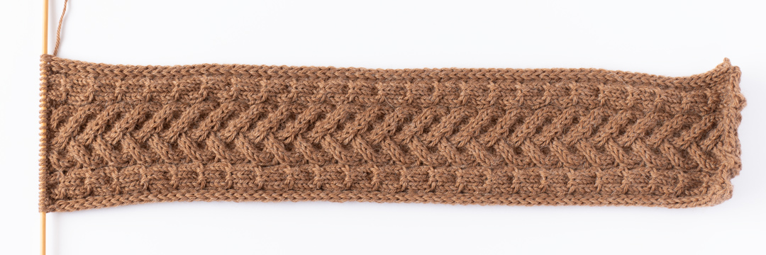 Row 6: K5, P4, K2, P12, K2, P4, K2, Sl3.
